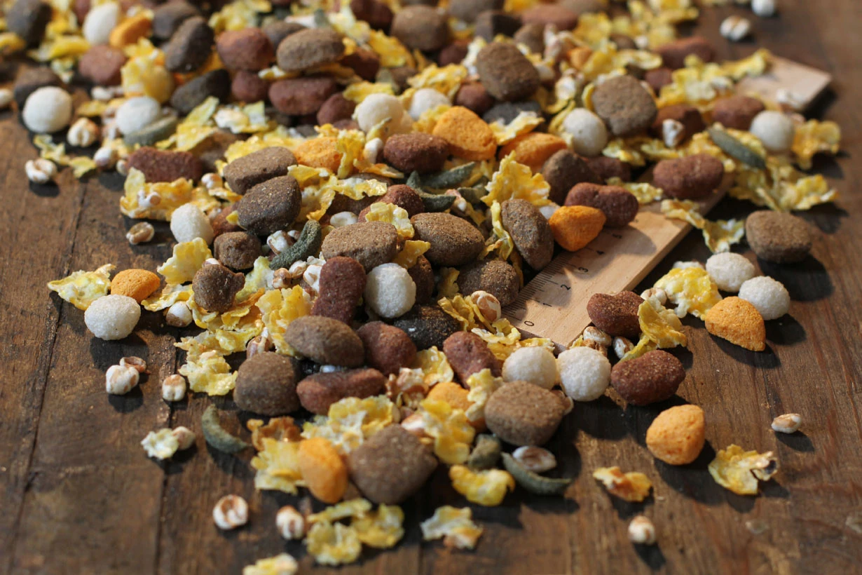 Maisflocken; Grieben, getrocknet (13 %); Weizen; Proteine aus der Gelatinegewinnung; Maisfuttermehl; Weizen, expandiert; Reis, extrudiert (4,5 %); Pflanzenöl (Palm; Kokos); Geflügelprotein; Bierhefe, getrocknet (2,5 %); Gemüse, extrudiert; Geflügelfett; Rübentrockenschnitzel, entzuckert; Geflügelleber, hydrolysiert; Fischmehl aus Meeresfischen; Gerste; Dicalciumphosphat; Natriumchlorid; Ei, getrocknet; Johannisbrotschrot, getrocknet; Calciumcarbonat; Kaliumchlorid
